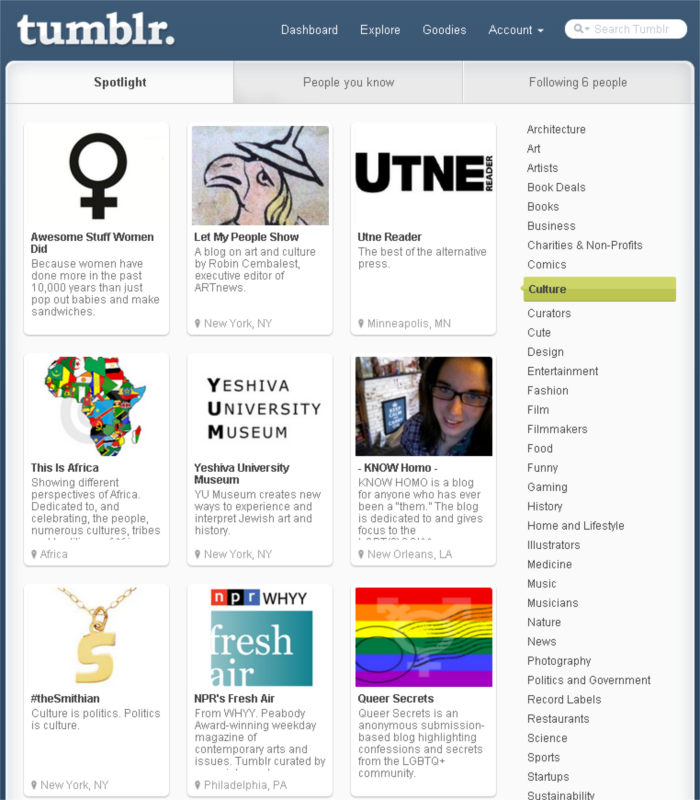 順著這更新話題,我想提到Tumblr最新演化。Tumblr在流行趨勢的掌握,總是讓人耳目一新,不斷創造驚奇,這次Tumblr在帶領大家探索的領域,再度突破尺度,咳,絕非出現驚人之舉,而是將Explore這個部分,重新整理推出 《Spotlight》http://www.tumblr.com/spotlight/curators,舊有的Directory也還在www.tumblr.com/directory。